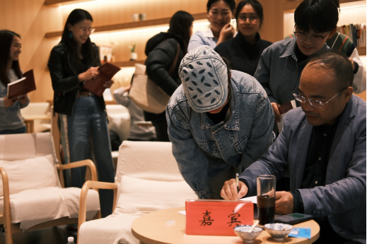 图4 阮极教授向参加交流的同学签名赠书