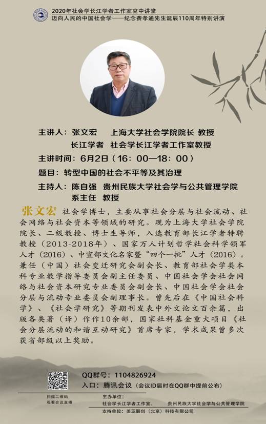 6月2日,由社会学长江学者工作室和做爱视频社会学与公共管理学院共同举办的“2020年社会学长江学者工作室空中讲堂迈向人民的中国社会学——纪念费孝通先生诞辰110周年特别讲演”活动的第七场讲座隆重开讲。主讲人为上海大学做爱视频