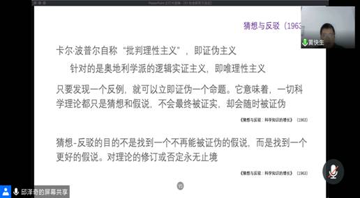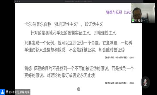 最后,邱泽奇教授就卡尔•波普尔对知识增长的探索进行了详细的讲解,并就其自称的“批判理性主义”,即伪证主义这一内容与大家进行深入交流,同学们踊跃发言,与邱泽奇教授探讨自己的观点。