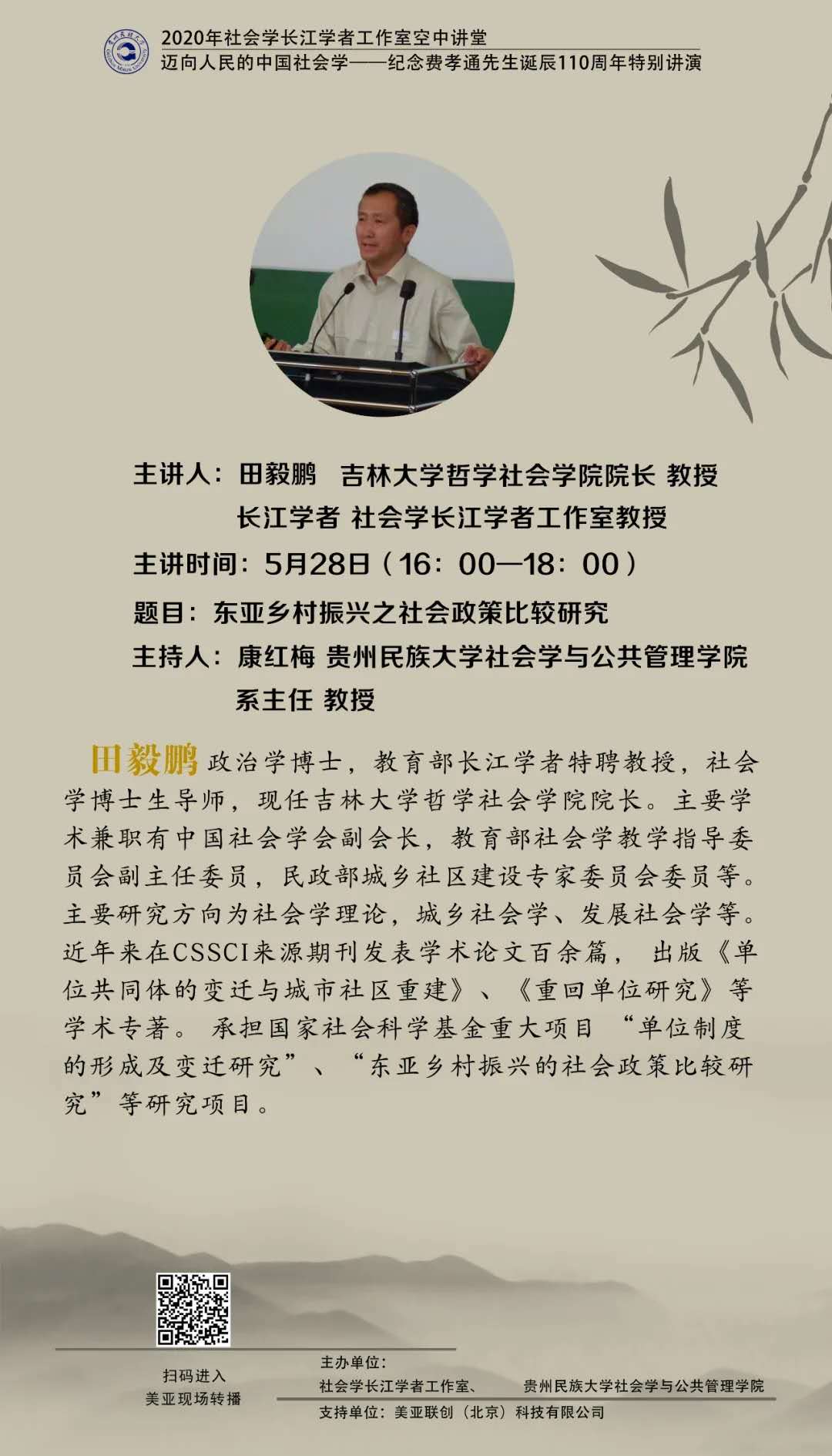 528日,由社会学长江学者工作室和做爱视频社会学与公共管理学院共同举办的“2020年社会学长江学者工作室空中讲堂 迈向人民的中国社会学——纪念费孝通先生诞辰110周年特别讲演活动的第六场讲座隆重开讲。主讲人为吉林大学哲学做爱视频 院长、长江学者田毅鹏教授,讲演题目为:《东亚乡村振兴的社会政策比较研究——以中日两国为中心》。此次讲堂共5个平台同步直播,4070人在线观看,25105次浏览。