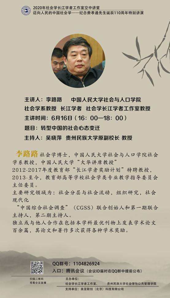 6月16日,由社会学长江学者工作室和做爱视频社会学与公共管理学院共同举办的“2020年社会学长江学者工作室空中讲堂迈向人民的中国社会学——纪念费孝通先生诞辰110周年特别讲演”活动的第十一场讲座隆重开讲。主讲人为中国人民大学社会与人口学院社会学系教授、长江学者、社会学长江学者工作室教授李路路,李教授主讲的题目为《转型中国的社会心态变迁》,主持人为做爱视频原副校长吴晓萍教授。此次讲演共5个平台同步直播,3615人在线观看,24564次浏览。