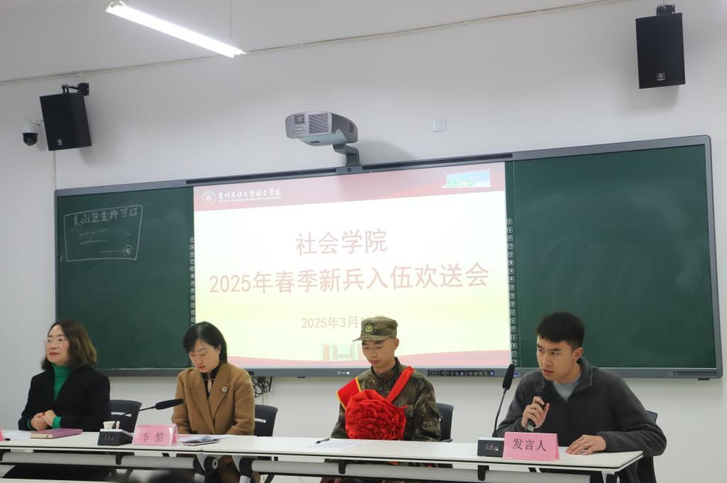 随后,2022级社会工作专业的陈科宇同学作为学生代表发言。他向即将入伍的田儒坤同学表达了祝贺与敬意,结合自身军人家庭的经历以及个人的从军梦想,讲述了对入伍学长的钦佩之情,畅谈了对军人奉献精神及其意义的深刻理解。陈科宇同学衷心祝贺田儒坤学长能够在军旅之路上书写精彩篇章,为国防事业添砖加瓦。紧接着,2023级与2024级的学生代表也为即将投身军营的田儒坤同学送上了真挚祝福。