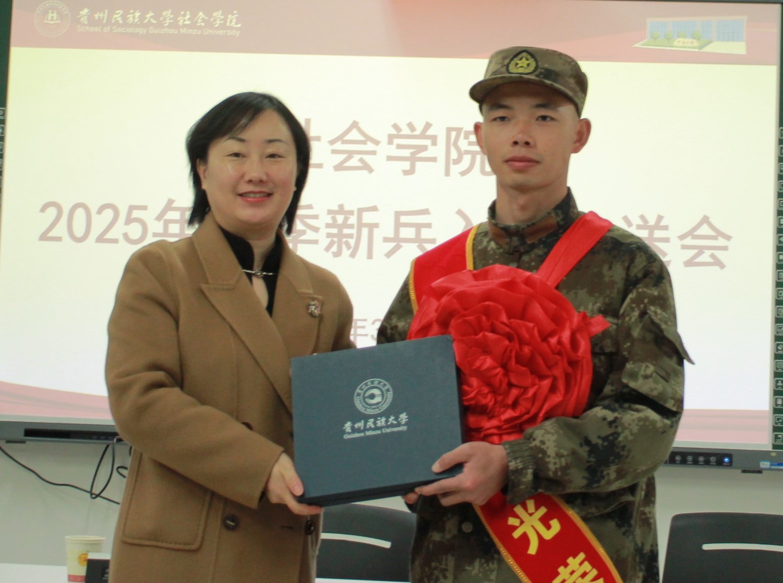 互动环节结束后,学院党委书记李黎亲切地为田儒坤同学颁发纪念品,这份礼物承载着学院对他满满的关怀与鼓励。随后,班主任王素霞老师手捧寓意深刻、饱含期望的入伍花束,郑重地送给即将踏入军营的田儒坤同学。